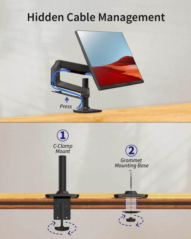 Effortless Setup E6 single monitor stand can be quickly installed in 3 steps by following installation paper instructions/online videos and then the pc stand will hold your monitors solidly on the desk.