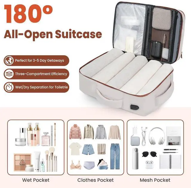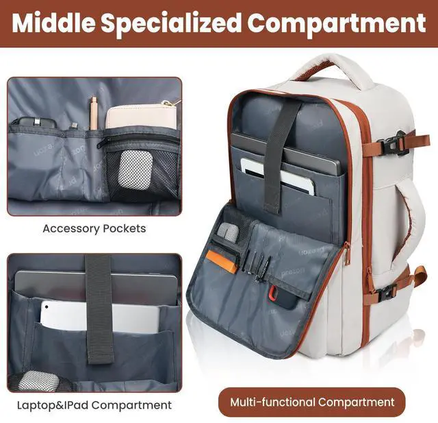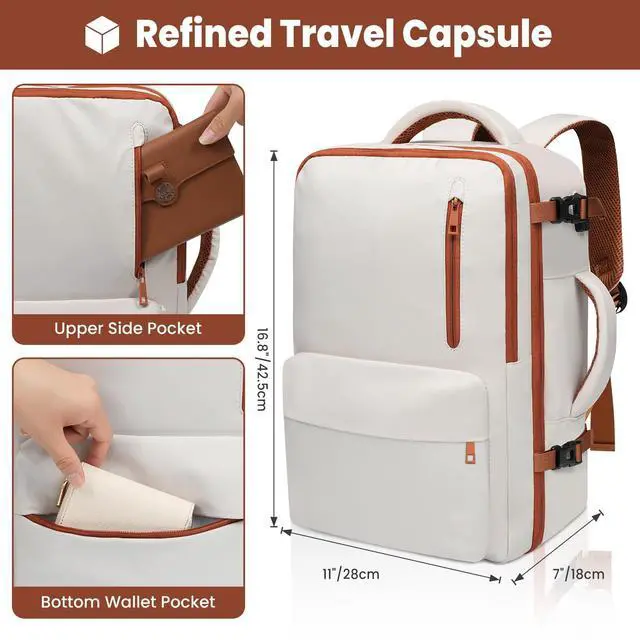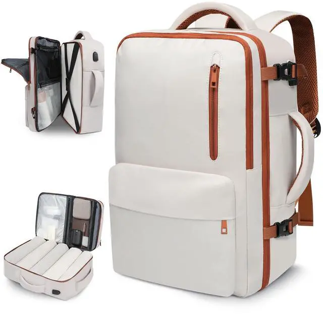 prezon 35L Travel Backpack ^^ 180° All-Open Design ^^ Multi-Pockets ^^ Airline Approved Carry on ^^ Backpack Fits 15.6 inch Laptop ^^ Waterproof ^^ USB Charging Port ^^ Expandable Storage for Clothes, Cream