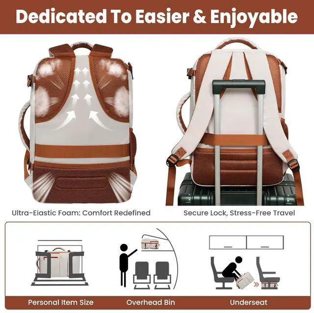 Flight Airline-Approved Personal Item Backpack : This travel-friendly carry-on backpack is designed to comply with airline regulations for personal items, easily fitting under the seat or in the overhead compartment. With its convenient 0-180 degree opening, you can quickly access your belongings and breeze through airport security. Weighing in at just 2.2 lbs, it meets the carry-on size requirements of most airlines.