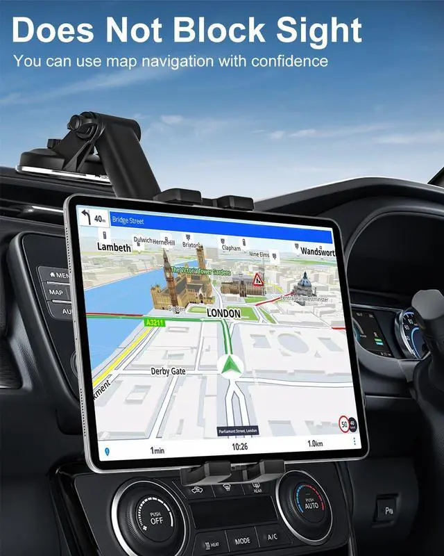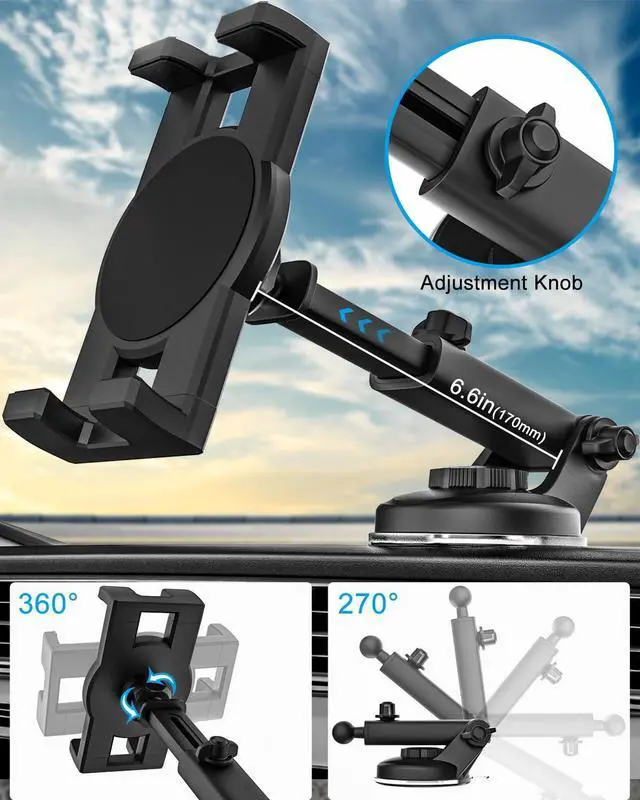 360° Rotating Clip & 270° Adjustable ArmThe dash tablet stand is designed with a rotating ball head, allowing you to rotate your tablet 360 degrees. The sturdy arm is 6.6 inches long and can be adjusted 270 degrees. The extension arm can be extended down to fit on your dashboard for perfect viewing angles (horizontal and vertical) without obstructing your view. Whether you're navigating or listening to the radio, it ensures very convenient and safe driving.