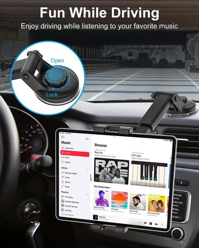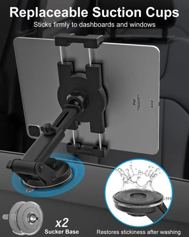 Replaceable Suction CupsThe car suction cup tablet holder comes with two replaceable super-strong suction cups. Providing powerful suction on smooth surfaces, the 360° rotation lock can adhere very firmly to textured flat car dashboards and windshields. It will not fall off even if twisted, bumped, or driven at high speed. The suction cups are reusable and washable. If they get dirty or lose their grip, simply rinse them with water and let them dry to regain their adhesive strength.