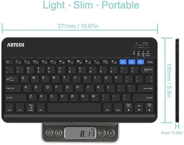 Sleek, ultra-slim design makes for easy portability. Compact size (271*150*6mm) and light weight (272g), makes this wireless keyboard extremely portable & the perfect travel accessory.