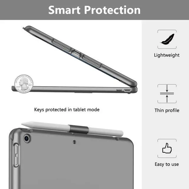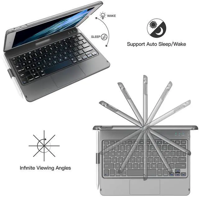 Various Viewing Angles With new and unique design, layered appearance and more convenient to use, allows 360° rotation and 180° flip.It provide multiple viewing angles makes sure to meet your different visual needs and easy to flip the iPad over, change your iPad to small laptop in seconds, a great work partner to share your work presentation. Whether you are typing, viewing, using FaceTime, or reading, our keyboard offers you limitless features and capabilities for your enjoyment