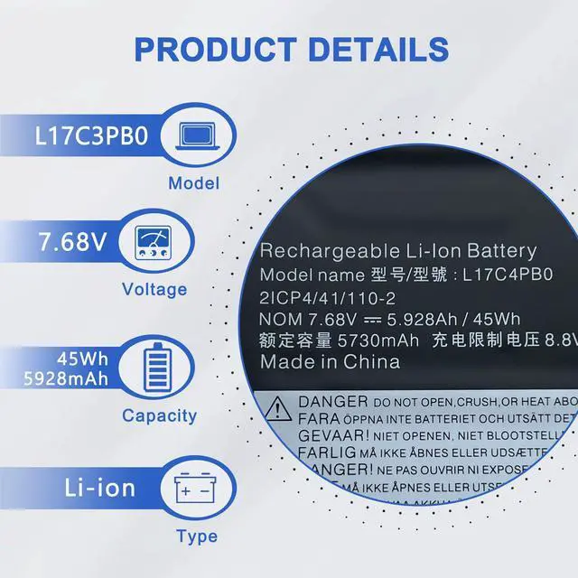 SpecificationsItem Model: L17C4PB0; Product Type: Replacement battery; Battery Type: Li-ion; Number of cell: 4 cell Voltage: 7.68V; Capacity: 45Wh/5928mAh; Battery Life: Up to 500 recharge cycles over the life of the battery.