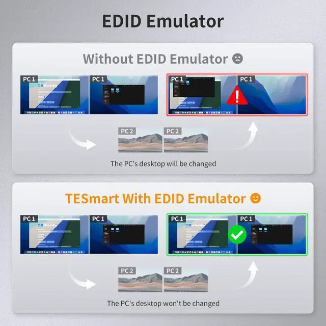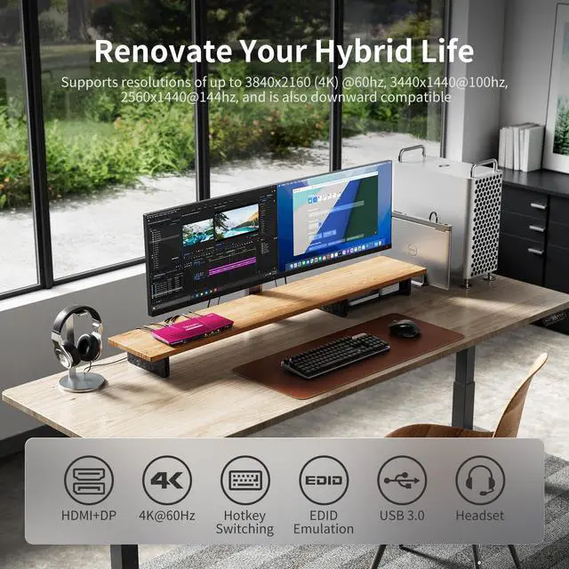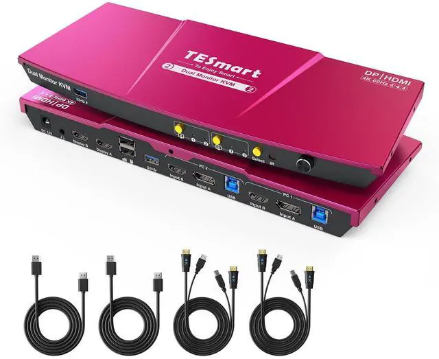 TESmart USB 3.0 DisplayPort + HDMI KVM Switch 2 Monitors 2 Computers 4K@60Hz, Dual Monitor KVM Switch 2 Port Extended Display, EDID Emulators, Headset, Hotkey Switch, Button Switch with All Cables
