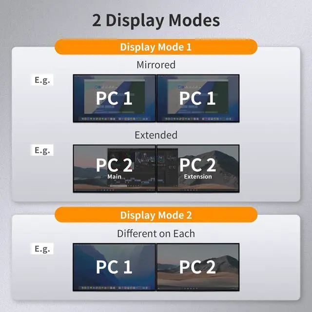 DisplayPort+HDMI KVM Switch 2 monitors 2 computers: Ideal for access 2 desktops or laptops with 2 monitors and 1 set of keyboard mouse. You can easily have a dual monitor setup per system or switch it to a single monitor system showing both systems (one on each monitor) and then easily toggle the keyboard/mouse between the 2 systems