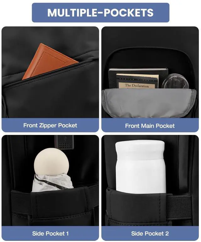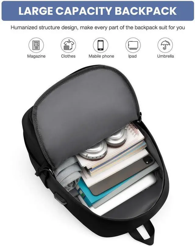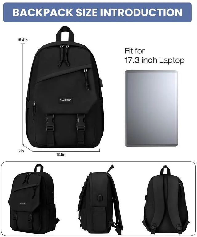 Large Capacity Backpack with Laptop CompartmentThis school backpack has 4 compartments. The main compartment fits 17.3 inch computer, books, clothes, A4 files, power bank and other school essentials. The 2 side pockets can easily hold 32oz water bottle and umbrella. The back anti-theft pocket of laptop backpack keeps your valuables (like your passport) safe and within easy reach. The front 2 pockets provide roomy space for charge device, iPad, wallets, notebook and other students necessities