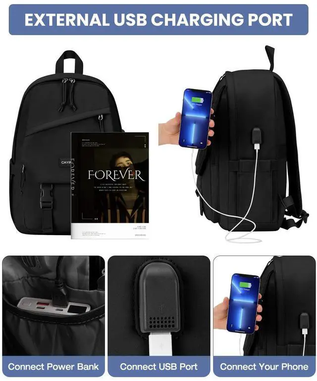Convenient USB Charging Port with Cable: This students backpacks is equipped with a built-in USB charging port and cable, allowing you to conveniently charge your devices on the go. Simply connect your power bank (not included) inside the school bag, and you can easily charge your phone, tablet, or other electronics through the external USB port, making it perfect college book bags for students, travelers, or anyone who needs a convenient way to stay powered up throughout the day ^