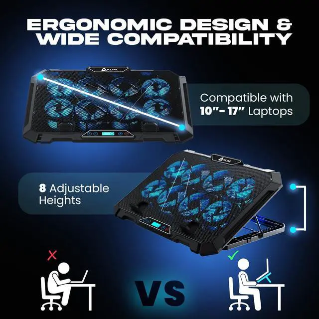 WIDE COMPATIBILITY + ERGONOMIC DESIGN: The laptop cooling stand has an ergonomic design that allows you to adjust the angle of your laptop for maximum comfort when you're working or playing. It's also compatible with the following sizes: 11 11,3 12 13 14 15 15,6 16 17 inches.