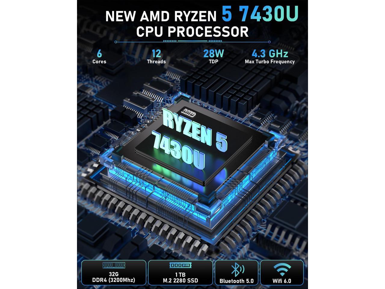 - AMD RYZEN 5 7430UThe Getorli mini pc is equipped with a high-performance AMD Ryzen 5 7430U processor (6 cores, 12 threads, maximum turbo frequency of 4.3GHz) with a default TDP of 15W (maximum 28W), easily meeting your daily office, casual gaming, and home entertainment needs