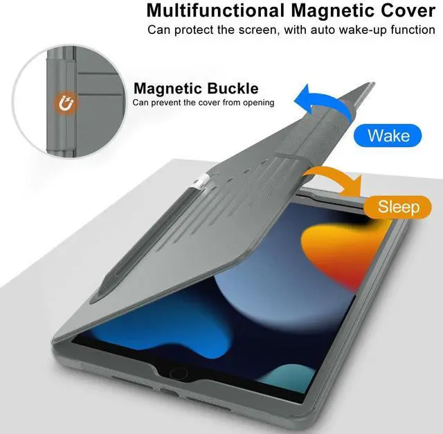 [Super Design] Magnetic smart cover supports auto wake&sleep function. There is a strong magnetic buckle in the cover, so your iPad 9th/8th/7th generation does not open a