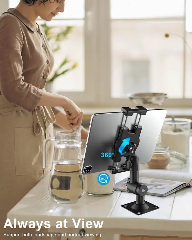 Flexible AdjustmentThis tablet wall mount is composed of one section durable aluminum alloy arm, that can be 360 degrees rotated due to the two-direction ball joint design.And