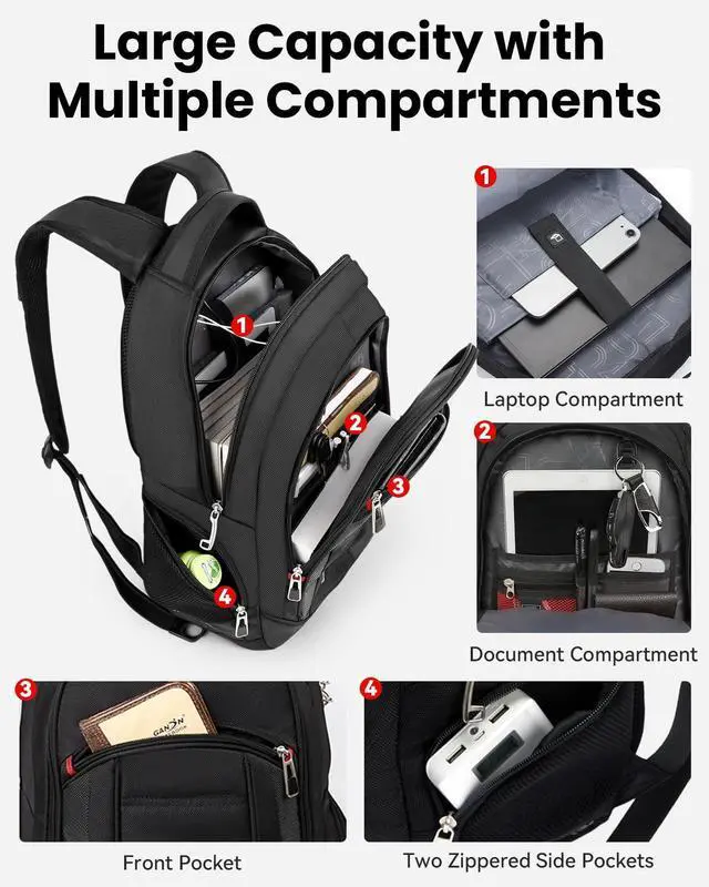 SMART ORGANIZATION: This large laptop backpack features multi-pocket design with dedicated compartment for business essentials: padded sleeve fits 17.3" laptop, large main section, document pocket, front organizer, and side pockets. Perfect for work and travel organization.