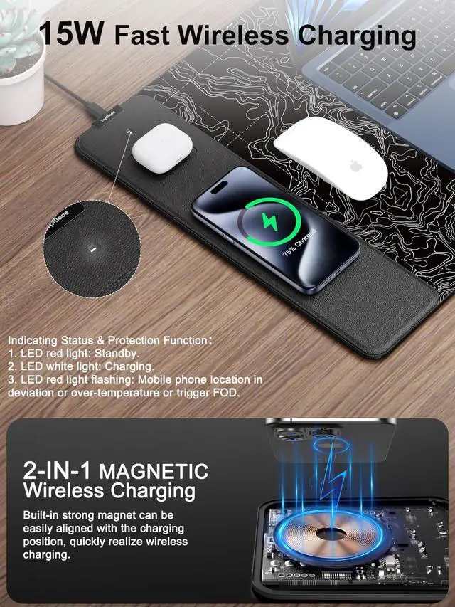 TopMade extended mousepad is 31.5" x 11.75", the extra large usable area covers your desk keyboard, mouse, and other items while gaming or working, and combines 3 functions of phone charging, AirPods charging, and mouse pad in one, allowing you to charge your iPhone and AirPods while using the gaming mousepad without the need for additional cables interfering with your desk, keeping your desk neat and tidy