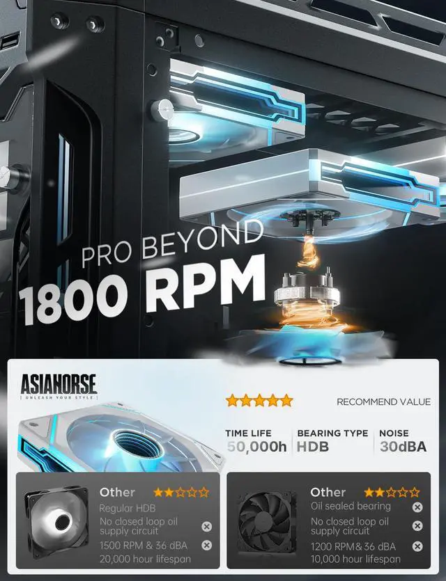 Ultra-High Performance HDB: This AMICI rgb fans adopts ultra-high-performance HDB, filled with oil to create a film between shaft & sleeve. This reduces metal friction, evaporation, ensures lubrication, cuts wear, & enhances efficiency. This allows for smoother and quieter PC fan operation, and greatly extends the life of the argb fans