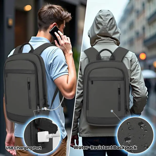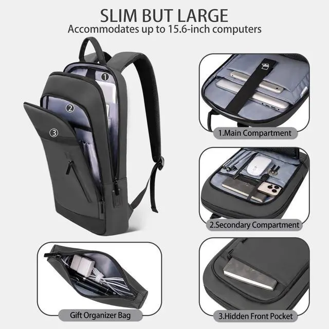 Fashion DesignMeticulously designed by our team, this slim mens backpack is truly one-of-a-kind.. In the front of the waterproof backpack there is a unique pouch designed for storing your data cable car keys headphones etc.. This anti-theft backpack features a unique hidden zipper design on the surface to protect your valuables.. The main compartment and the second compartment have multiple multi-functional pockets designed exclusively for storing small items.