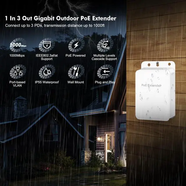Outdoor Gigabit PoE Passthrough Switch, 1 PoE in 3 PoE Out Extender, IEEE802.3af/at PoE Powered, 10/100/1000Mbps Ethernet, Wall Mount Waterproof Plug and Play