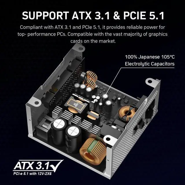 • Support ATX 3.1 & PCIe 5.1: Compliant with the ATX 3.1 standard to fuel high-performance PC components with stability, efficiency, and power spike resistance. Meanwhile, supporting PCIe 5.1 platform withstands 2x transient power excursions from the GPU.