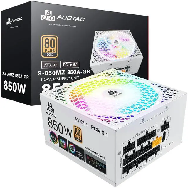 Auotac 850W Fully Modular Power Supply 80+ Gold Certified with 12V-2x6 Cable ATX 3.1 & PCIe 5.1 Compliant, 140mm RGB Low-Noise Smart Fan, 105-Rated Capacitors, White