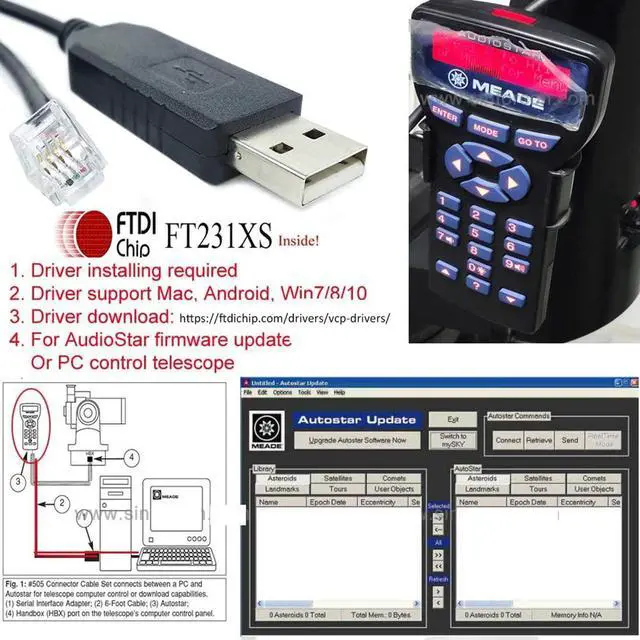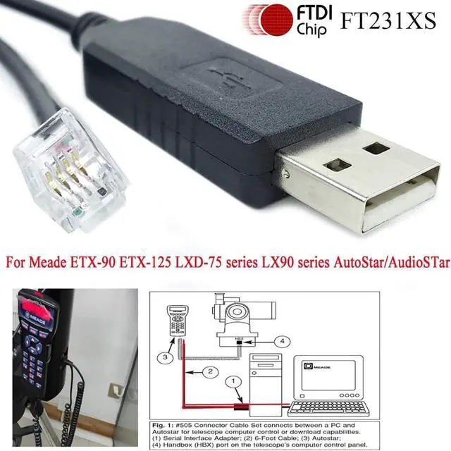 DIY Meade 505 Telescope to PC Cable USB RS232 to 4P4C RJ10 Handbox Autostar Cable; This cable is compatible with Meade HBX 497 and AutoStar/AudioStar, compatible with Meade Stella Wifi, compatible with Meade LX65, ETX127 ETX125 ETX125AT ETX125EC ETX-70 ETX-90 LXD75 LX80 LX90. It can connect directly Meade LX85 and computer to update firmware and control telescope. Geniune FTDI FT231XS Chipset from UK. USB RS232 Interface Cable. USB 2.0 to Connect your PC. RJ9 RJ10 4P4C to Connect your Handbox Autostar, Replaced Old Version USB to DB9 and DB9 to RJ10 Cable.