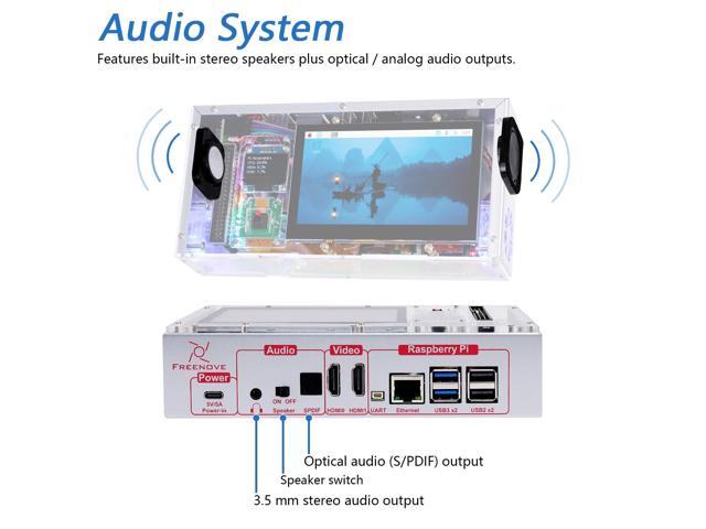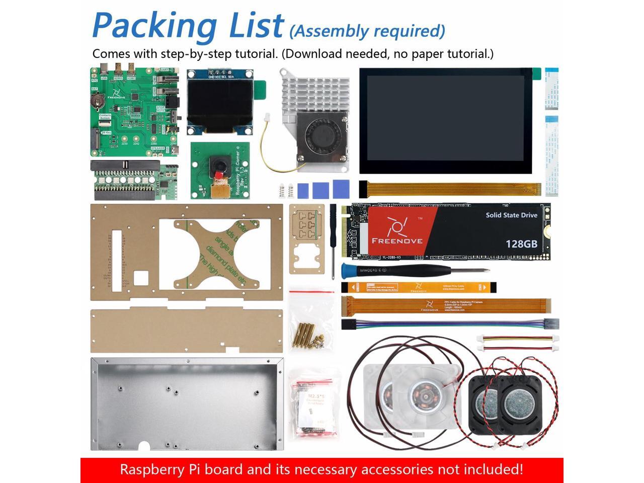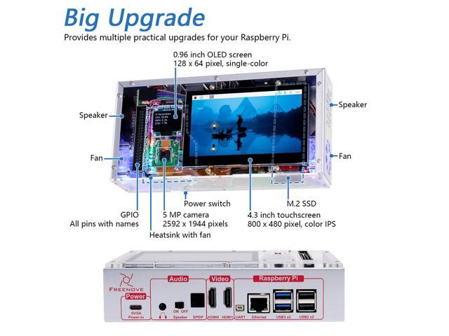 FREENOVE Raspberry Pi 5 Case with Screen (4.3'' Touchscreen), 128GB M.2 NVMe SSD 800 MB/s, 5 MP Camera, OLED Screen, Stereo Speakers, 3.5 mm and Optical Audio (S/PDIF)
