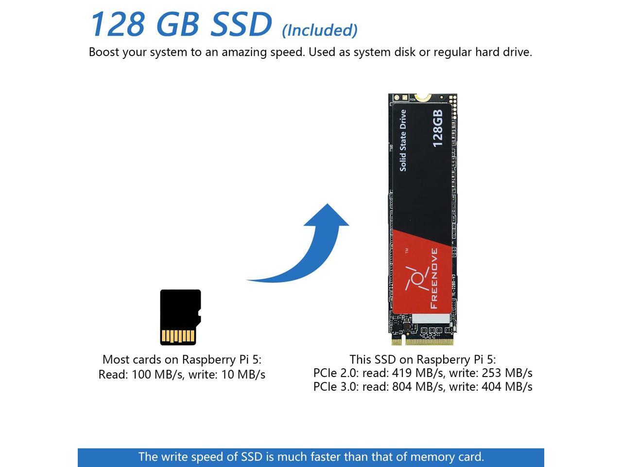 - M.2 SSD Slot (128 GB SSD included): Boost your system to an amazing speed by upgrading memory card (usually read: 100 MB/s, write: 10 MB/s) to SSD (PCIe 2.0: read: 419 MB/s, write: 253 MB/s; PCIe 3.0: read: 804 MB/s, write: 404 MB/s. Tested with this SSD on RPi 5) (The write speed of SSD is much faster than that of memory card)