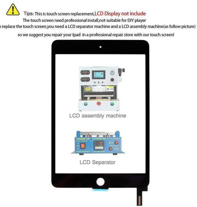 NOTICESell For Pro Repair Shop!!! If you do not have any experience, please have it installed by the professionals to avoid any problem. Because it needs Additional laminating machine to be installed successfully. Instructions1. Please remove the protective film from the screen, then put it into the LCD assembly machine. 2. Put the glue cover on the LCD, be carefule, alignment should be precise. 3. Tap the centre of the screen. Do not press vigorously or use large areas of your hand to press.