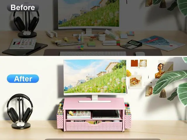 High-quality materials: The computer monitor stand riser is made of durable wood and a sturdy steel pipe frame, allowing it to withstand years of use and reliable performance. The drawer and 2 hanging pen holders are made of high-quality environmentally friendly plastic, which is thick and durable while making the product more beautiful