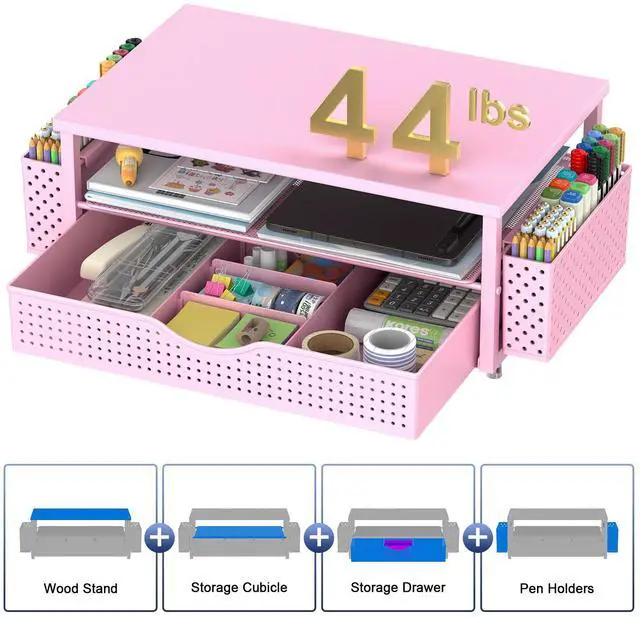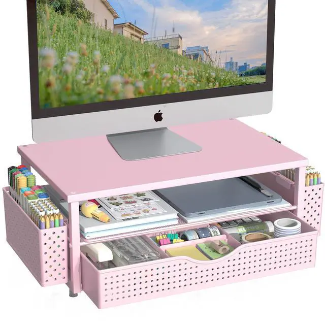Desk Organizer and Accessories, Computer Monitor Stand Riser with Drawer and 2 Pen Holders, Office Desk Accessories & Workspace Organizers for Office Supplies (Pink)