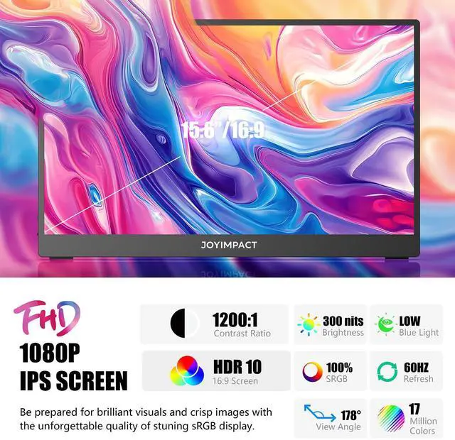 Laptop Portable MonitorJoyImpact laptop screen extender with FHD 1920 x 1080 resolution lets you work and play anywhere. With its sleek design and lightweight construction, it's easy to take with you wherever you go, expanding the screen to increase multitasking efficiency. Perfect for presentations, gaming and work, this portable external monitor is a must-have for anyone looking to stay productive and entertained.