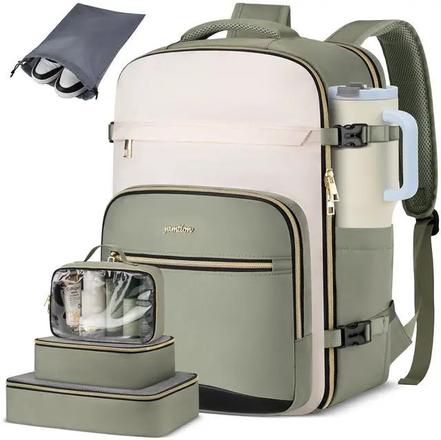 4 Extra Packing Cubes for StorageComes with4 extra packing cubes, this personal item travel backpack offer enough space for storing clothes, toiletries and your shoes. And the wet/dry seperation design of the travel backpack prevent any leaks or moisture from affecting your other personal items.