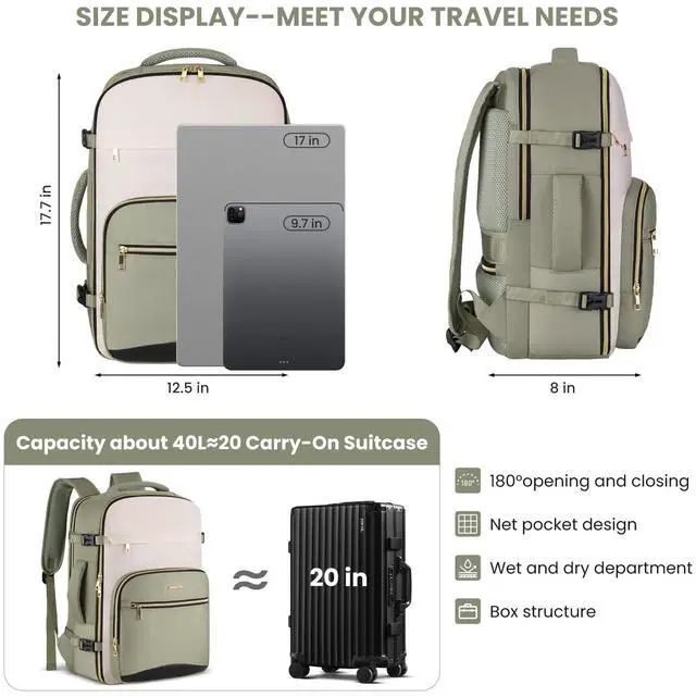 Practical & Flight ApprovedFeatured a suitcase-style 180°opening for easy access to your belongings at security checkpoints, this large travel backpack fits perfectly overhead bin and under the seat which approved by Easy Jet, Spirit, Jet Blue, Frontier, United and other budget airlines.The carry on luggage makes yo