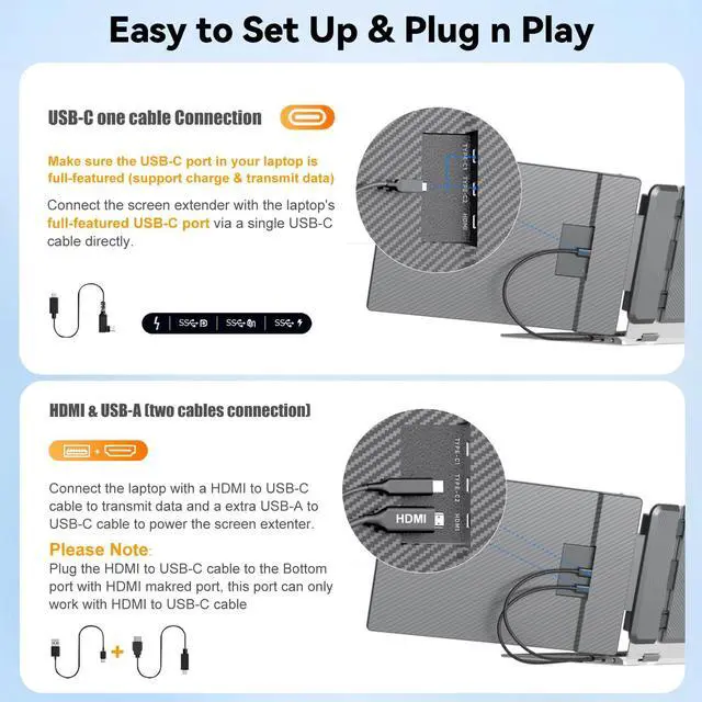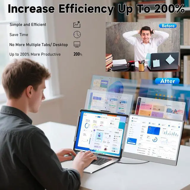 Boost Your Productivity By Up to 200%The dual laptop monitor extender offers multiple display modes, including extended, mirrored, and portrait modes. Supports you to open multiple windows at the same time, work, video conference, watch movies, or play games on different screens by not having to switch back and forth on a single laptop screen continuously, increase your efficient by up to 200%. Perfect for people who work on the go remote workers, watch a movieIT professionals, Players, Stock traders, Programmers, game players, etc!