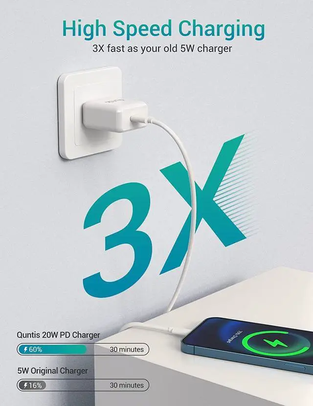 [ULTRA-FAST CHARGING] 20W Rapid iPhone charger with type c to lightning cable, charges iPhone 13 up to 50% in just 30 minutes, which saves more than 1 hour for you, when compared to the 5W original charger. Note: Quntis USB C fast charger set helps to access the FAST CHARGING easily at home or office.