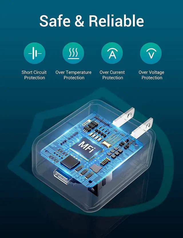 [SAFE CHARGING] the iPhone lightning Fast charger has multipotent safety system ensures complete protection for your lightning devices. The ETL certified 20W iPhone USB-C wall charger built-in over-voltage protection, features a stable voltage. The USB C to lightning cord built-in smart chip to match the current required.