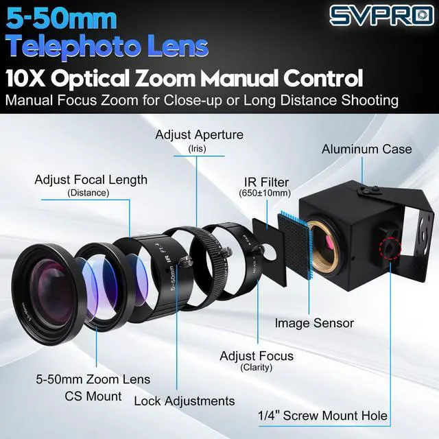 SVPRO 5MP 30FPS USB Camera with 5-50mm Telephoto Lens, 10X Optical Zoom Manual Focus Webcam for Macro & Long Distance, Low Light Computer Camera with IMX335 Sensor for Windows, Mac-OS, Linux, Andorid