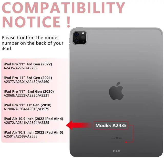 COMPATIBILITY: This iPad 11 Pro case with keyboard is designed for the iPad Air 5th Gen 2022 (model A2588/A2589/A2591), iPad Air 4th Gen 2020 (model A2072/A2316/A2324/A2325), iPad Air 11" 2024 M2 (model A2902/A2903/A2904), iPad Air 11" 2025 M3 (model A3267/A3270), iPad Pro 11 1st-4th (model 2018-2022: A1980/A2013 A1934/A1979/A2068/A2228/A2230/A2231/A2301/A2377/A2459/A2460/A2435/A2759/A2761/A2762). Please be sure to check your iPad model, or ask our customer service staff for help