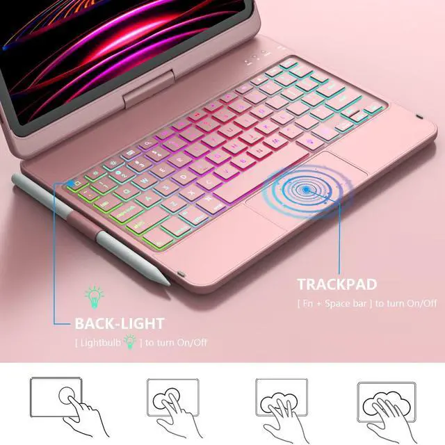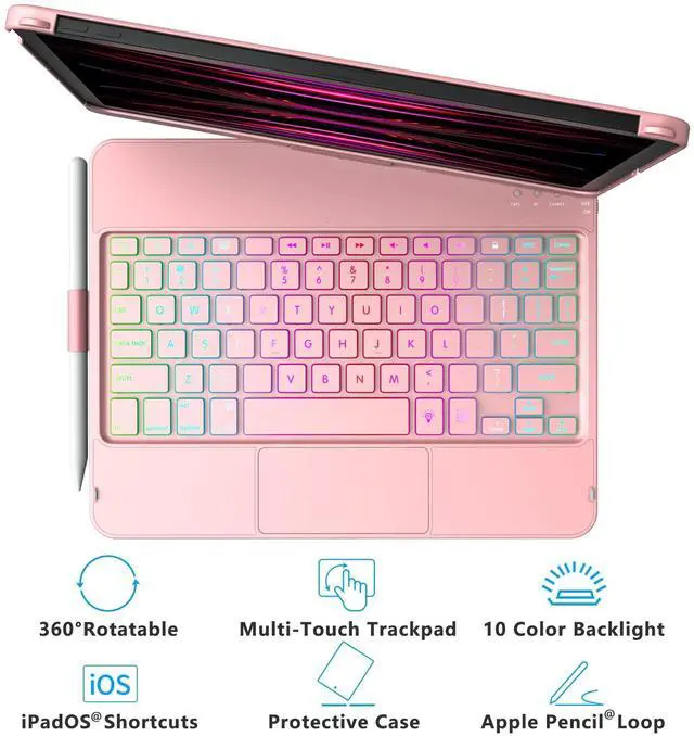 MMK iPad 11 Pro Case with Keyboard | Compatible with iPad Air (4th, 5th Gen | M2, M3) & iPad Pro 11 inch (2018-2022, 1st-4th) | 10 Color Backlight & 360 Rotation with Multi-Touch Trackpad-Rose Gold