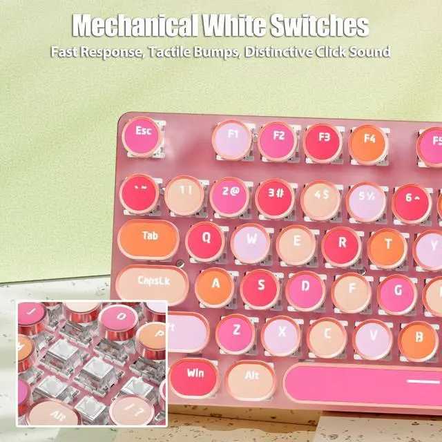 [Typewriter Keyboard with Mechanical Switches] - This retro punk keyboard features mechanical white switches and round keycaps with golden rings, combining vintage style and modern technology. The white switches have a lifespan of 60 million keystrokes, offering fast response, tactile bumps, and a distinctive click sound. The keycaps adopt double-shot injection molding te