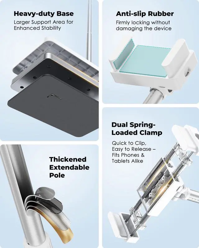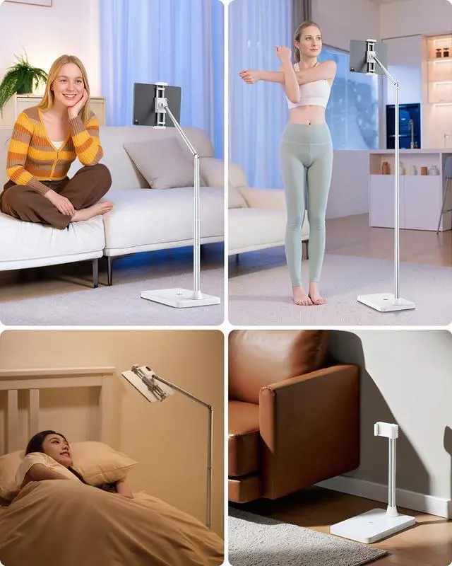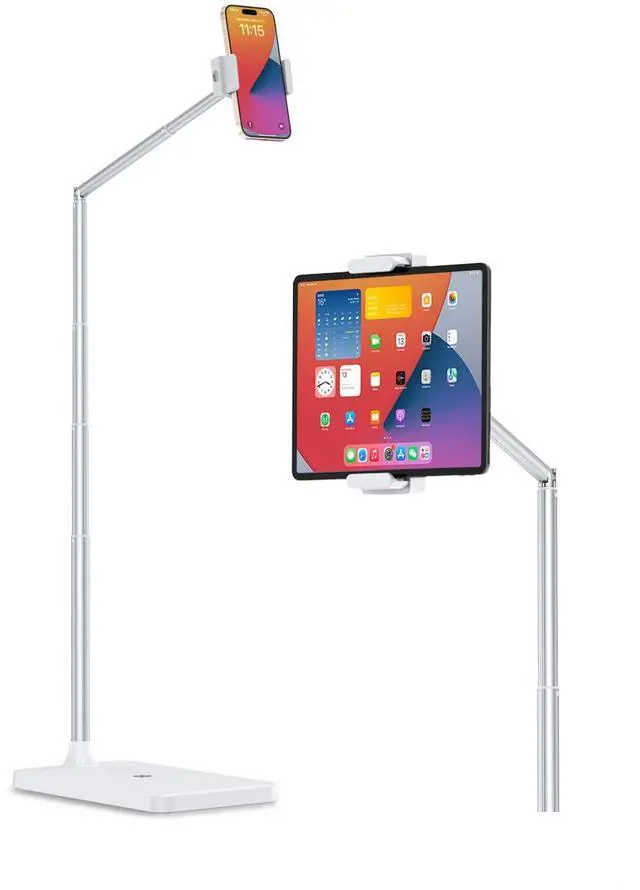 Multi-Device Compatible & Dual-Mode Clip Holder This tablet floor stand fits smartphones, tablets, and gaming devices from 3.5" to 11", compatible with iPhone X/13/14/15/16 series (Pro/Max/Mini/Plus), Galaxy, iPad Air, iPad mini, LG, Google Pixel, and more. The dual-mode clip easily switches between smartphone mode (2.364.09") and tablet mode (5.518.46") by pressing the top right and bottom left buttons simultaneously and gently pulling the clips. A versatile iPad stand floor users will love.