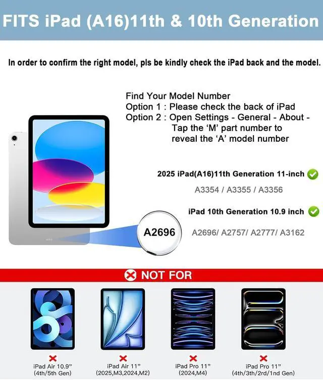 [Compatibility] - Exclusively designed for iPad (A16) 11th Generation 11 Inch 2025 (Model Number: A3354 / A3355 / A3356), iPad 10th Generation 10.9 Inch 2022 (Model Number: A2696 / A2757 / A2777 / A3162). NOT compatible with any other devices.