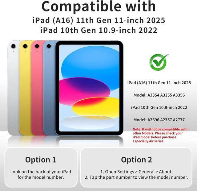 Designed for the new iPad (A16) 11th generation 11-inch 2025 (Model: A3354, A3355, A3356) and iPad 10th generation 10.9-inch 2022 (Model: A2696, A2757, A2777). Note: It will not be compatible with other Models. Please check your iPad model before purchase. Especially Air series.