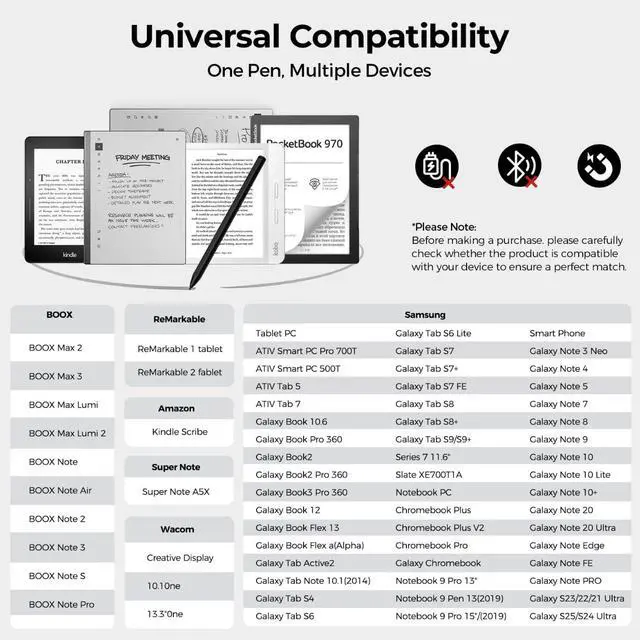 Compatibility check: EMR-only stylus; works with Kindle Scribe, reMarkable 1/2, BOOX, select Samsung Galaxy Tab S models and other EMR tablets; will not work with iPad/Apple Pencil, Canvas Color e-ink models (reMarkable Paper Pro, Paper Pro Move), Samsung Galaxy Tab A series, ordinary touch phones/tablets, or battery/Bluetooth pens; verify device support and undock any OEM pen before use