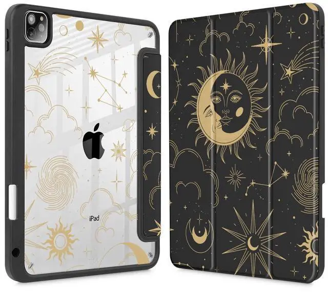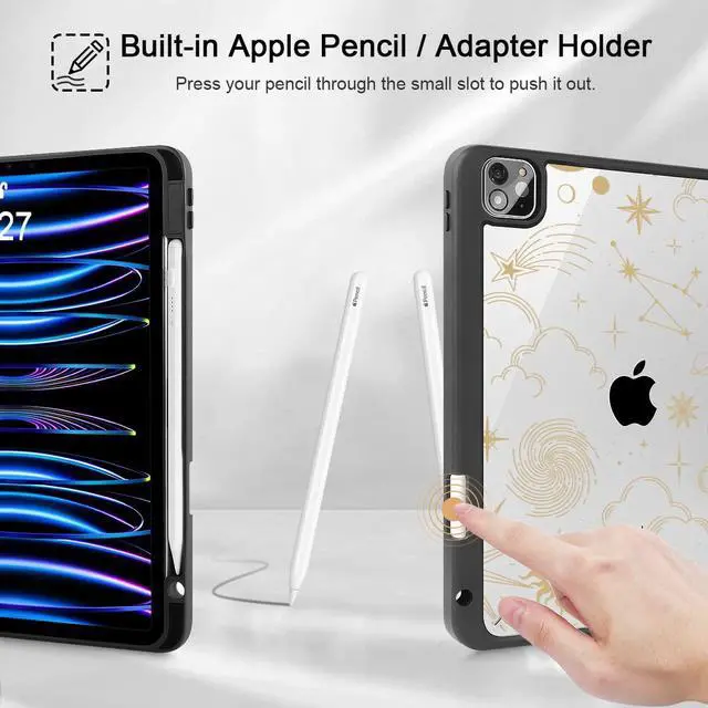 Tuiklol Case for iPad Pro 12.9 Inch M2 Case 2022 2021 2020 2018 Generation 6th/5th/4th/3rd,Built-in Pencil 2nd Holder Clear Transparent Protective Back Shell Cover,Moon and Star