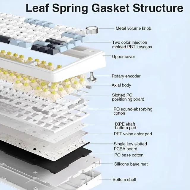 [Redefining Space Efficiency]The F75 is a 75% layout keyboard with a length of 323mm, which saves about 120mm of desktop space compared to traditional keyboards. And it has 80 keys and a multifunctional metal knob that can be used to adjust the volume level and quickly switch between light effects.Easy to travel with, perfect for those who have the need to carry a keyboard on the go