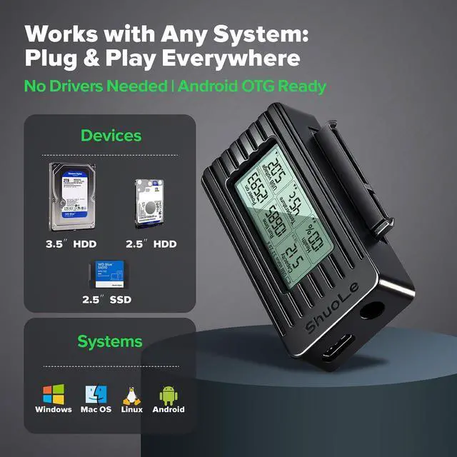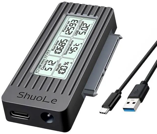 Smart Disk Management at Your Fingertips Unlock unprecedented control over your storage devices with ShuoLe's revolutionary LCD-equipped adapter. The integrated diagnostic screen delivers real-time critical metrics: Total Data Writes (Lifetime usage tracking) Power-On Hours (Precise workload monitoring) Disk Health Score (S. M. A. R. T. -based % rating) Operating Temperature (Prevent overheating damage) USB Voltage (Ensure stable power delivery)