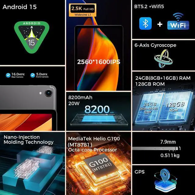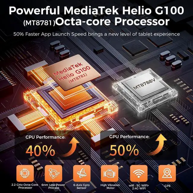 Powerful Performance: Powered by the MediaTek Helio G100(MT8781) processor, this latest 11-inch tablet comes with the latest Android 15 operating system with support for more applications and a 2.2 GHz octa-core processor for improved graphics performance. You will enjoy the smoother running than Android 15 system. Perfect for watching videos, learning, video chatting and reading e-books. The 6nm architecture ensures efficiency and speed, making it ideal for handling demanding apps with ease.