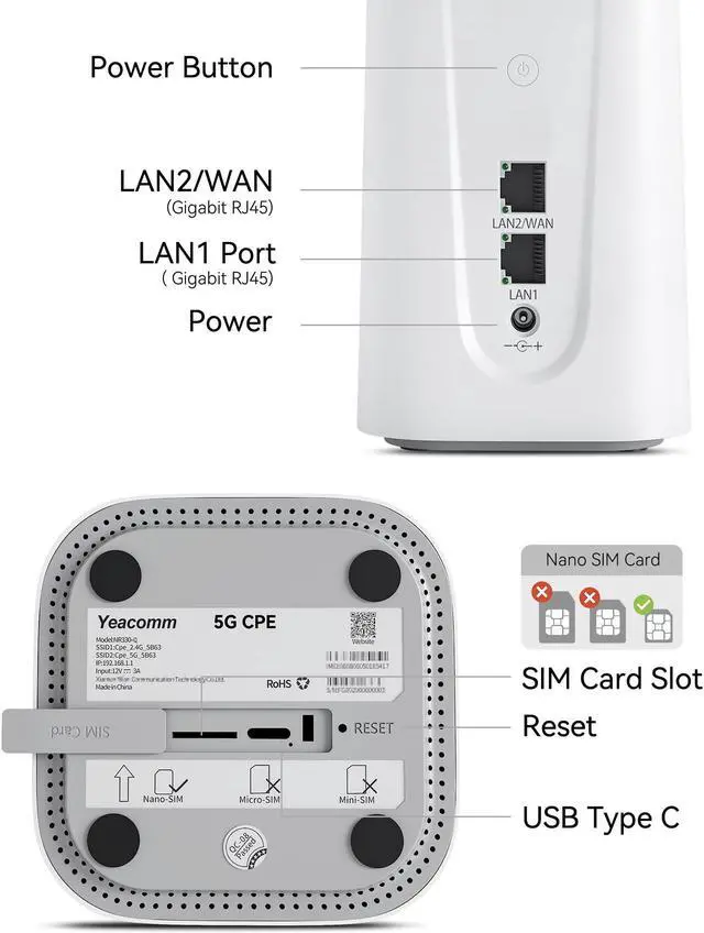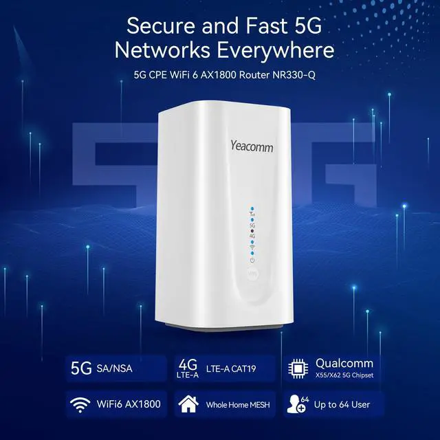 Lightning-fast Qualcomm Snapdragon SDX62 5G NR SA / NSA Modem Inside: Yecomm 5G Router combines commercial grade wireless 5G NR(speeds of up to 3.47Gbps)and 4G LTE Cat19(speeds of up to 1.8Gbps), brings you ultra-fast speed and stable 5G mobile network. The 5G router is also backward compatible with 4G LTE networks and 3G networks, covers the world's mainstream bands.