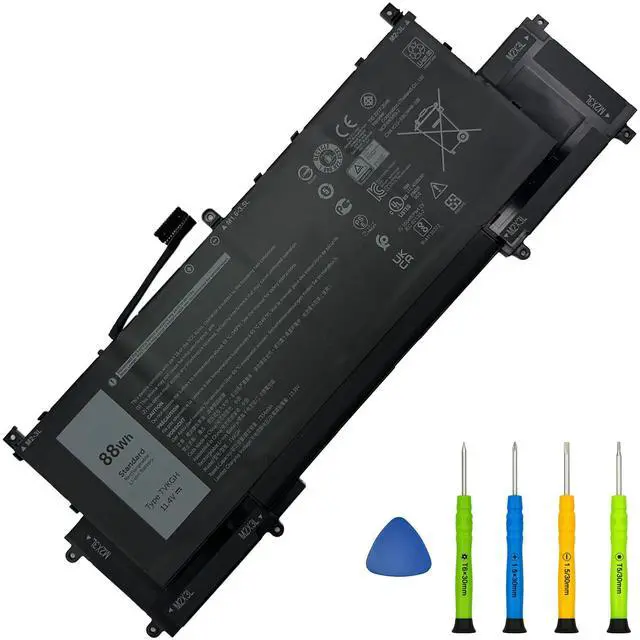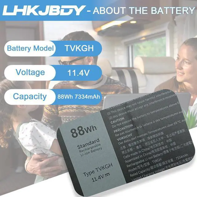Specifications: Type: TVKGH ; Voltage: 11.4V; Capacity: 7334mAh/88Wh; Color: Black. Battery type: Lithium-Ion; The Packages includes: 1pcs TVKGH Laptop Battery Replacement, 2pcs Screwdrivers, 1 pcs Instruction for TVKGH Battery. The batteries are certified by UL and CE, ensuring safety and high performance