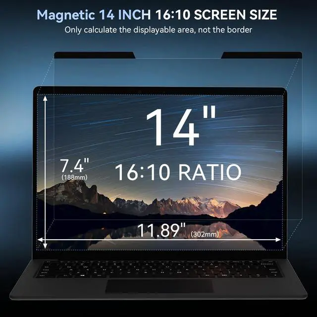 CompatibilityWidth: (11.89 inch/302 mm), Height: (7.40 inch/188 mm), Diagonal:14" (355.6 mm). - Aspect Ratio 16:10. This 14" Magnetic privacy filters is designed to be compatible with Lenovo, HP, Dell, Acer, Asus, Samsung, and other 14in 16:10 Aspect ratio laptop brands. Please verify your screen's width and height measurements before ordering as it's not recommended to only measure your screen's diagonal size. Contact us if you have any questions about dimensions.